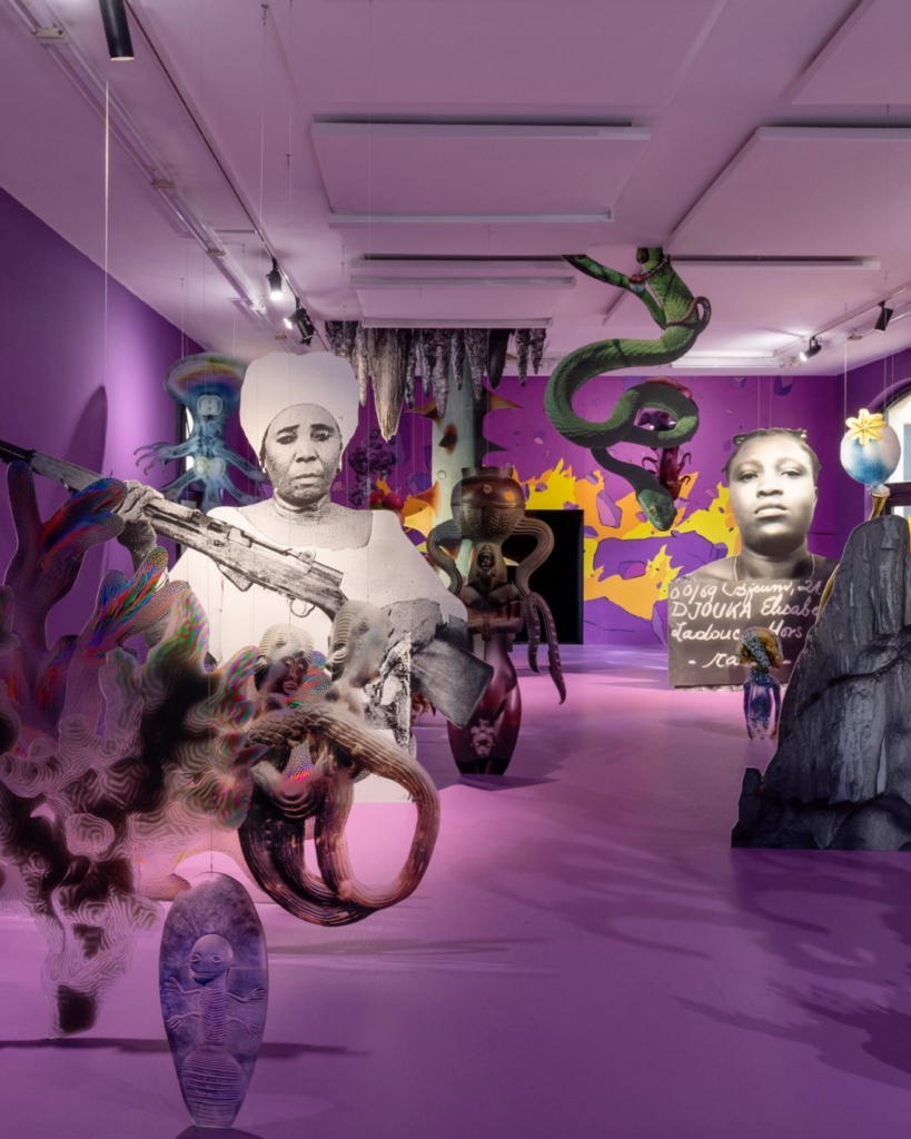 © Josèfa Ntjam, “Sanctuaire des pluies anciennes”, 2025. Vue de l’exposition “INTRICATIONS” à l’IAC Villeurbanne, 2025. Courtesy de l’artiste et NICOLETTI, Londres. © ADAGP, Paris, 2025. Photo : Ivan Erofeev